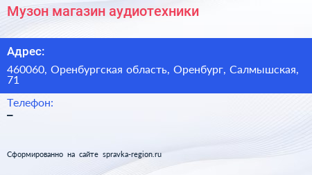 Музон, магазин аудиотехники по адресу 460060, Оренбургская область, Оренбург, Салмышская, 71 в дальнейшем Организация, размещена в следующих категориях: