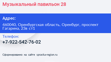 Музыкальный павильон №28 по адресу 460040, Оренбургская область, Оренбург, проспект Гагарина, 23в ст1 в дальнейшем Организация, размещена в следующих категориях:
