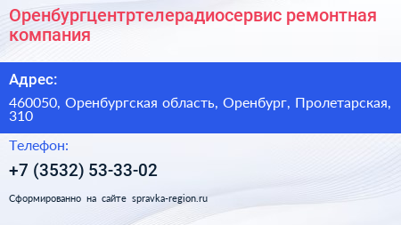 Оренбургцентртелерадиосервис, ремонтная компания по адресу 460050, Оренбургская область, Оренбург, Пролетарская, 310 в дальнейшем Организация, размещена в следующих категориях: