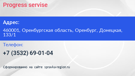 Progress servise по адресу 460001, Оренбургская область, Оренбург, Донецкая, 133/1 в дальнейшем Организация, размещена в следующих категориях: