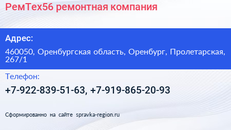 РемТех56, ремонтная компания по адресу 460050, Оренбургская область, Оренбург, Пролетарская, 267/1 в дальнейшем Организация, размещена в следующих категориях: