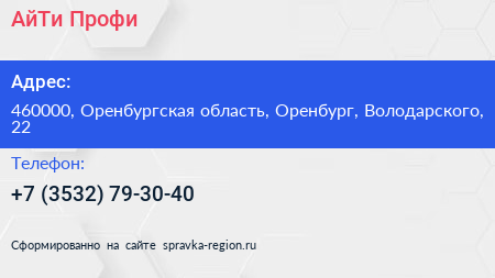 АйТи-Профи по адресу 460000, Оренбургская область, Оренбург, Володарского, 22 в дальнейшем Организация, размещена в следующих категориях: