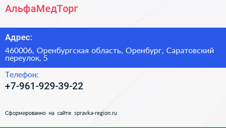 АльфаМедТорг по адресу 460006, Оренбургская область, Оренбург, Саратовский переулок, 5 в дальнейшем Организация, размещена в следующих категориях:
