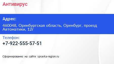 Антивирус по адресу 460048, Оренбургская область, Оренбург, проезд Автоматики, 12г в дальнейшем Организация, размещена в следующих категориях:
