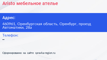 Aristo, мебельное ателье по адресу 460961, Оренбургская область, Оренбург, проезд Автоматики, 28а в дальнейшем Организация, размещена в следующих категориях: