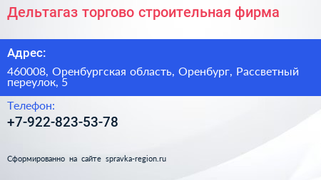 Дельтагаз, торгово-строительная фирма по адресу 460008, Оренбургская область, Оренбург, Рассветный переулок, 5 в дальнейшем Организация, размещена в следующих категориях: