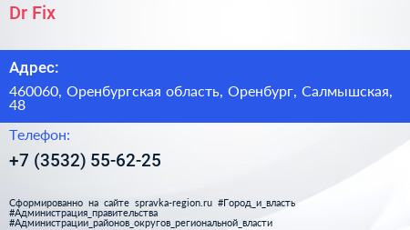 Dr.Fix по адресу 460060, Оренбургская область, Оренбург, Салмышская, 48 в дальнейшем Организация, размещена в следующих категориях: