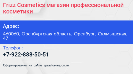 Frizz Cosmetics, магазин профессиональной косметики по адресу 460060, Оренбургская область, Оренбург, Салмышская, 47 в дальнейшем Организация, размещена в следующих категориях: