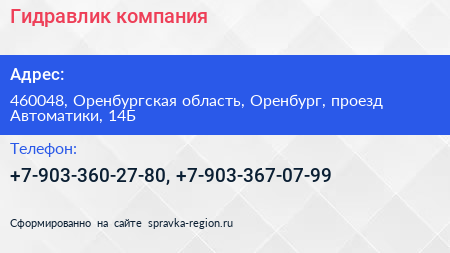 Гидравлик, компания по адресу 460048, Оренбургская область, Оренбург, проезд Автоматики, 14Б в дальнейшем Организация, размещена в следующих категориях: