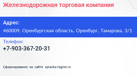 Железнодорожная торговая компания по адресу 460009, Оренбургская область, Оренбург, Тамарова, 3/1 в дальнейшем Организация, размещена в следующих категориях: