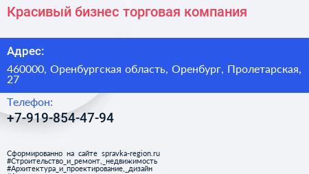 Красивый бизнес, торговая компания по адресу 460000, Оренбургская область, Оренбург, Пролетарская, 27 в дальнейшем Организация, размещена в следующих категориях: