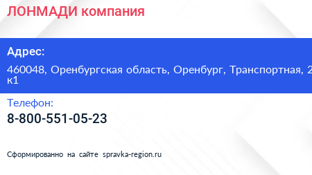 ЛОНМАДИ, компания по адресу 460048, Оренбургская область, Оренбург, Транспортная, 2 к1 в дальнейшем Организация, размещена в следующих категориях: