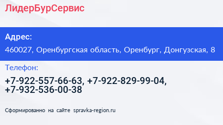 ЛидерБурСервис по адресу 460027, Оренбургская область, Оренбург, Донгузская, 8 в дальнейшем Организация, размещена в следующих категориях: