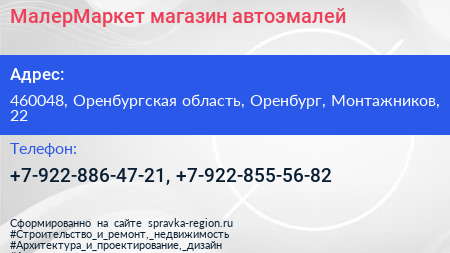 МалерМаркет, магазин автоэмалей по адресу 460048, Оренбургская область, Оренбург, Монтажников, 22 в дальнейшем Организация, размещена в следующих категориях: