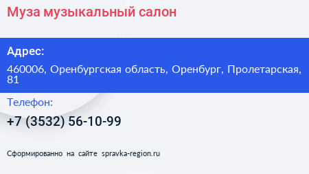 Муза, музыкальный салон по адресу 460006, Оренбургская область, Оренбург, Пролетарская, 81 в дальнейшем Организация, размещена в следующих категориях: