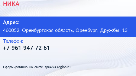 НИКА по адресу 460052, Оренбургская область, Оренбург, Дружбы, 13 в дальнейшем Организация, размещена в следующих категориях: