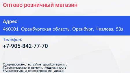 Оптово-розничный магазин по адресу 460001, Оренбургская область, Оренбург, Чкалова, 53а в дальнейшем Организация, размещена в следующих категориях: