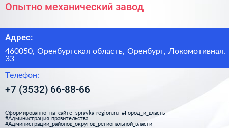 Опытно-механический завод по адресу 460050, Оренбургская область, Оренбург, Локомотивная, 33 в дальнейшем Организация, размещена в следующих категориях:
