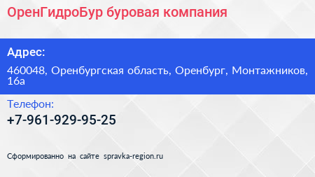 ОренГидроБур, буровая компания по адресу 460048, Оренбургская область, Оренбург, Монтажников, 16а в дальнейшем Организация, размещена в следующих категориях: