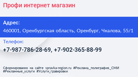 Профи, интернет-магазин по адресу 460001, Оренбургская область, Оренбург, Чкалова, 55/1 в дальнейшем Организация, размещена в следующих категориях: