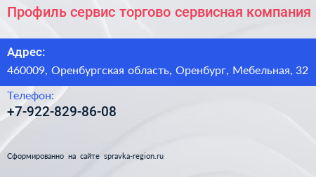 Профиль сервис, торгово-сервисная компания по адресу 460009, Оренбургская область, Оренбург, Мебельная, 32 в дальнейшем Организация, размещена в следующих категориях:
