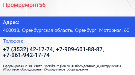 Промремонт56 по адресу 460018, Оренбургская область, Оренбург, Моторная, 60 в дальнейшем Организация, размещена в следующих категориях: