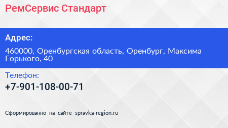 РемСервис Стандарт по адресу 460000, Оренбургская область, Оренбург, Максима Горького, 40 в дальнейшем Организация, размещена в следующих категориях: