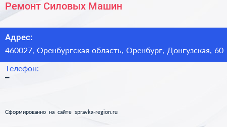 Ремонт Силовых Машин по адресу 460027, Оренбургская область, Оренбург, Донгузская, 60 в дальнейшем Организация, размещена в следующих категориях: