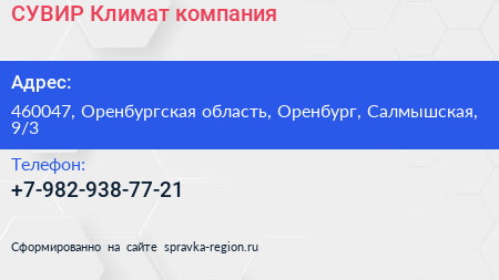 СУВИР Климат, компания по адресу 460047, Оренбургская область, Оренбург, Салмышская, 9/3 в дальнейшем Организация, размещена в следующих категориях: