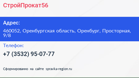 СтройПрокат56 по адресу 460052, Оренбургская область, Оренбург, Просторная, 9/8 в дальнейшем Организация, размещена в следующих категориях: