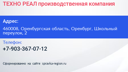 ТЕХНО-РЕАЛ, производственная компания по адресу 460008, Оренбургская область, Оренбург, Школьный переулок, 2 в дальнейшем Организация, размещена в следующих категориях: