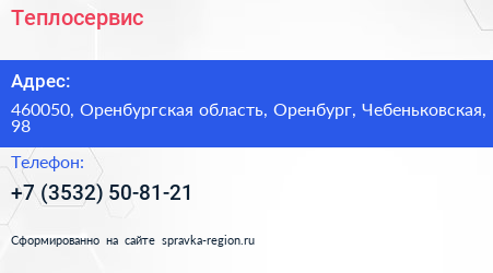 Теплосервис по адресу 460050, Оренбургская область, Оренбург, Чебеньковская, 98 в дальнейшем Организация, размещена в следующих категориях: