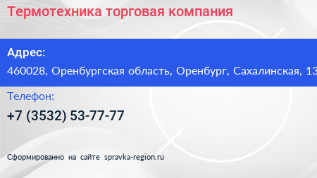 Термотехника, торговая компания по адресу 460028, Оренбургская область, Оренбург, Сахалинская, 13 в дальнейшем Организация, размещена в следующих категориях: