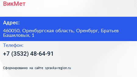 ВикМет по адресу 460050, Оренбургская область, Оренбург, Братьев Башиловых, 1 в дальнейшем Организация, размещена в следующих категориях: