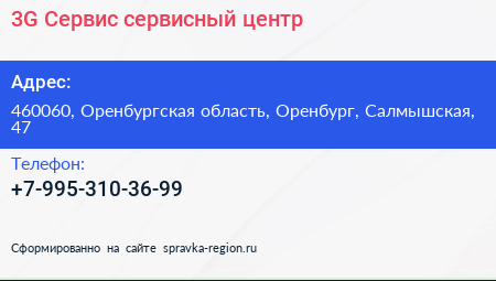 3G Сервис, сервисный центр по адресу 460060, Оренбургская область, Оренбург, Салмышская, 47 в дальнейшем Организация, размещена в следующих категориях: