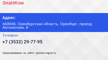 ЭлаНКом по адресу 460048, Оренбургская область, Оренбург, проезд Автоматики, 8 в дальнейшем Организация, размещена в следующих категориях: