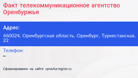 Факт, телекоммуникационное агентство Оренбуржья по адресу 460024, Оренбургская область, Оренбург, Туркестанская, 22 в дальнейшем Организация, размещена в следующих категориях:
