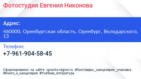 Фотостудия Евгения Никонова по адресу 460000, Оренбургская область, Оренбург, Володарского, 13 в дальнейшем Организация, размещена в следующих категориях: