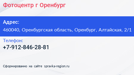 Фотоцентр, г. Оренбург по адресу 460040, Оренбургская область, Оренбург, Алтайская, 2/1 в дальнейшем Организация, размещена в следующих категориях: