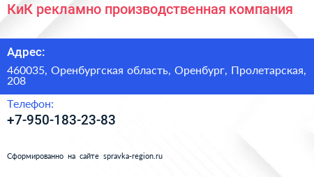 КиК, рекламно-производственная компания по адресу 460035, Оренбургская область, Оренбург, Пролетарская, 208 в дальнейшем Организация, размещена в следующих категориях: