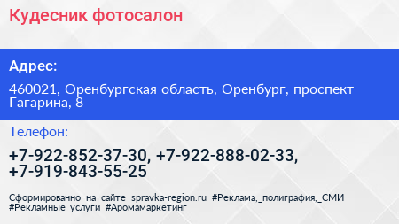 Кудесник, фотосалон по адресу 460021, Оренбургская область, Оренбург, проспект Гагарина, 8 в дальнейшем Организация, размещена в следующих категориях: