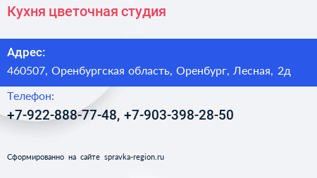 Кухня, цветочная студия по адресу 460507, Оренбургская область, Оренбург, Лесная, 2д в дальнейшем Организация, размещена в следующих категориях: