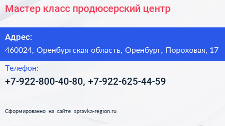 Мастер-класс, продюсерский центр по адресу 460024, Оренбургская область, Оренбург, Пороховая, 17 в дальнейшем Организация, размещена в следующих категориях: