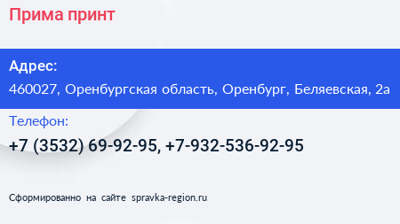Прима принт по адресу 460027, Оренбургская область, Оренбург, Беляевская, 2а в дальнейшем Организация, размещена в следующих категориях: