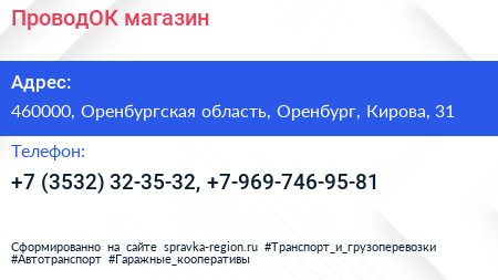 ПроводОК, магазин по адресу 460000, Оренбургская область, Оренбург, Кирова, 31 в дальнейшем Организация, размещена в следующих категориях: