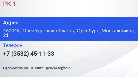РК №1 по адресу 460048, Оренбургская область, Оренбург, Монтажников, 21 в дальнейшем Организация, размещена в следующих категориях: