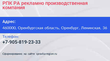 РПК-РА, рекламно-производственная компания по адресу 460000, Оренбургская область, Оренбург, Ленинская, 36 в дальнейшем Организация, размещена в следующих категориях:
