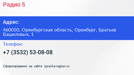 Радио 5 по адресу 460050, Оренбургская область, Оренбург, Братьев Башиловых, 1 в дальнейшем Организация, размещена в следующих категориях: