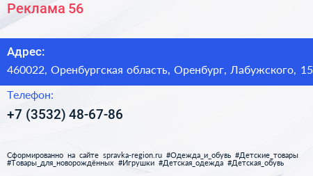 Реклама 56 по адресу 460022, Оренбургская область, Оренбург, Лабужского, 15 в дальнейшем Организация, размещена в следующих категориях: