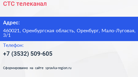 СТС, телеканал по адресу 460021, Оренбургская область, Оренбург, Мало-Луговая, 3/1 в дальнейшем Организация, размещена в следующих категориях: